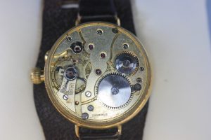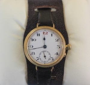 Lot 52 – An Early 20th Century “Francois Borgel” 18ct Gold Trench Wristwatch, white enamelled dial, with Arabic numerals, case marked F.B., and bears a date letter similar to Sheffield 1919, but no import mark, case no. 113708, on leather strap.
