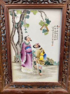 Lot 327 – A Chinese porcelain table screen, the multicoloured panel painted two figures standing beneath a tree, in pierced wooden stand 68cm high x 44cm wide, visible plaque 34.75cm high x 23cm wide. Ex Addisons Barnard Castle lot 141, 03/01/2013.