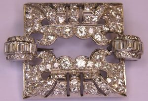 Lot 211 – A Diamond Plaque Brooch, of square shape, unmarked, set 128 stones, in baguette, brilliant, and single cut, approx 3 carats overall, in 1940’s style, 3cm x 4cm, overall.
