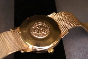 Lot 259 – A Gent’s 9ct Gold Omega ” Seamaster” Wristwatch, with automatic movement, silvered dial, with mixed baton and Arabic numerals, a.f. to glass, on a mesh link bracelet strap, original winding crown, unboxed, and lacking paperwork.