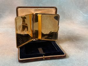 Lot 267 – A George V 9ct gold cigarette case with engine-turned decoration, Birmingham 1935, engraved to interior “Mollie Christmas 1936”, approx. 105g, in lined case initialled M.A.