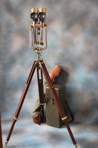 Lot 236 – A Pair of WWII German Cast Metal and Brass 12×72 Trench Binoculars, possibly by “Kern”, circa 1940, N41, with graticuled lenses, 51cm high, together with a field grey coloured carrying case, stamped 500, 22cm x 57cm, and a mahogany and brass tripod, in leather and canvas bag, possibly by ” George Fischer of Switzerland and Germany”, stamped “GF Nr285”, approx. 92cm long, folded, casing polished, and some leather fittings slightly a.f.
