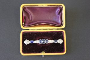 Lot 216 – A Platinum Bar Type Brooch, Set Twelve Diamonds, approx. 0.91 carats, and Five Sapphires, in lined box.